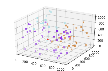 ax.scatter(data[np.where(clu[:,i]==1)][:,0],data[np.where(clu[:,i]==1)][:,1],data[np.where(clu[:,i]==1)][:,2], c = color[i],marker='s')